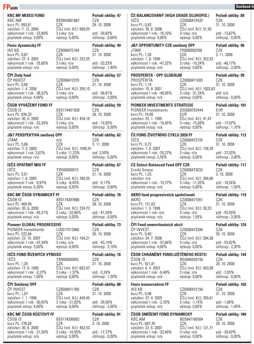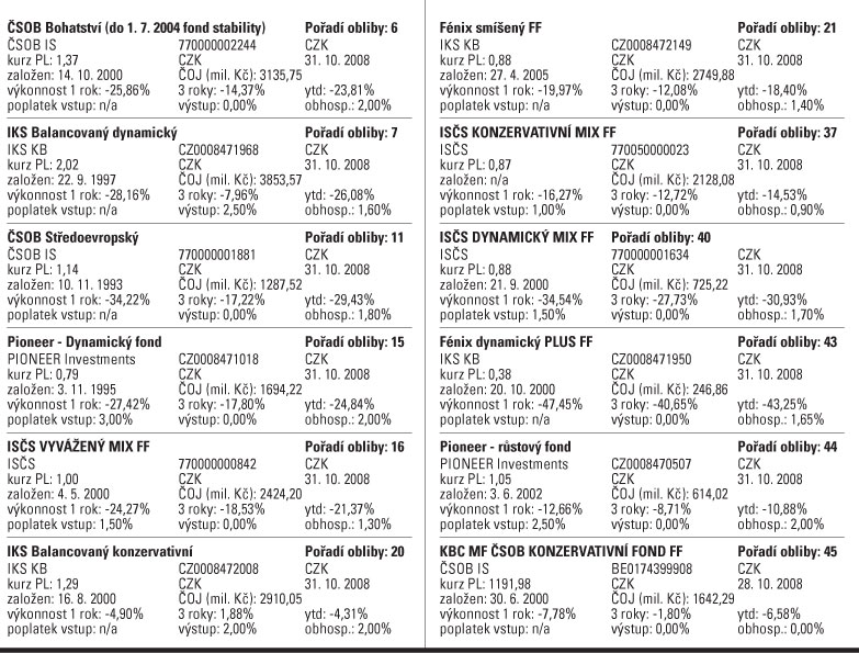 Ani smíšené fondy neprocházejí šťastným obdobím. Obvykle se při silných poklesech akciových trhů lépe daří dluhopisovým složkám portfolia, ale k tomu tentokrát nedochází, ba naopak. Klesají tedy hodnoty obou složek, takže ty dynamické strategie se ztátami blíží akciovým fondům a i ty nejkonzervativnější převyšují ztráty dluhopisových fondů. Spolu s tím klesá i jejich obliba: po první asi miliardové vlně odkupů z počátku roku došlo k určitému zklidnění, ale od jara z nich u nás odešly další více než 4 miliardy korun. Jen za samotný říjen je následovalo dalších 1,5 miliardy korun.