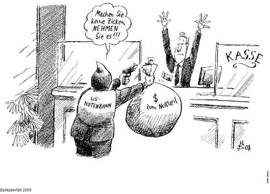 Novou strategii Fedu hezky ilustruje kreslený vtip z deníku FT Deutschland. Pracovník centrální banky přepadává přepážku v nějaké komerční bance a říká: nehýbejte se, vezměte si peníze!