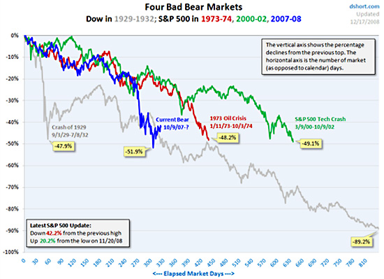 Server Calculated risk dnes přináší graf, který se jmenuje „Čtyři špatní medvědi“ a srovnává pokles cen akcií během posledních čtyř důležitých krizí. Na grafu vidíme, že akciový pokles začíná připomínat období Velké deprese.