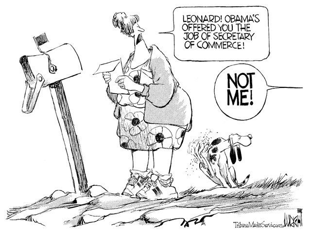 I New York Times si dělají legraci z toho, jak se Obamovi nedaří vybrat ministra obchodu, zatím se s uchazeči spálil. Vtip přiložený k tomuto blogu je jak od Renčína: Táto, píše ti Obama, jestli bys toho ministra obchodu nevzal ty! -- To tak.
