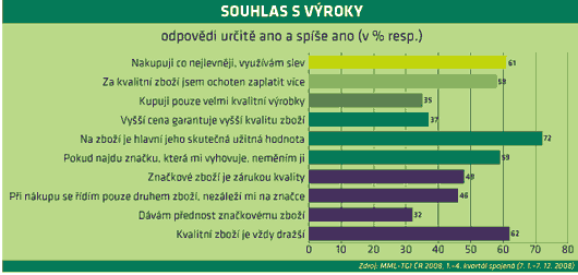 Co se týká krize a nálady českých spotřebitelů, stále převažuje mírně optimistické očekávání. Aktuální situace ještě neznamená automatický nákup levných značek, ale naopak oprášení starého hesla "nejsem tak bohatý, abych si mohl kupovat levné věci". Studie identifikuje čtyři strategie chování a typy reakcí na krizi. Čtyři základní postoje k současné situaci jsou určeny na základě toho, zda dopady krize na jedince jsou pozitivní, či negativní a zda osobní postoj jedince k situaci je aktivní, či pasivní.