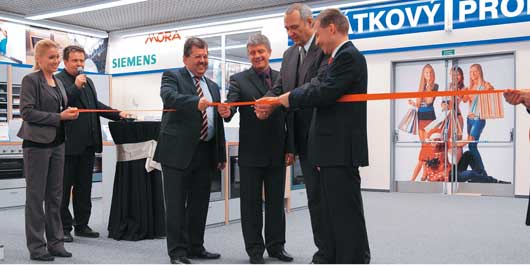 Prodejnu přestřižením pásky slavnostně otevřeli (zleva): primátor města Plzeň Pavel Rödl společně se starostou MO Plzeň 3 Jiřím Strobachem, jednatelem Expert Elektro Peterem Weissem a majitelem K+B Elektro Expert Josefem Kappenbergerem.