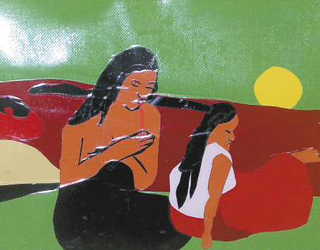 Přiznaná citace slavného Gauguinova obrazu Tahiťanky.