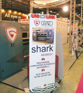 Hlavním magnetem pro návštěvníky expozice však byl velkoprodukční tiskový stroj Shark X8/960UV, nyní doplněný o automatický podavač deskových materiálů. Tato aplikace tak umožňuje realizovat tisky na desky až do výše 80 mm ve všech tiskových režimech (rychlostech), které se běžně využívají při tisku flexibilních materiálů. Největší výhodou této technologie je tedy to, že v produkčním tiskovém modu může zákazník využít rychlost tisku až 120 m2/hod., pro všechny druhy materiálů.