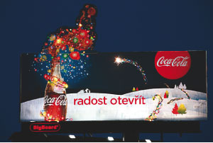 Společnost BigMedia realizovala vánoční kampaň pro Coca-Colu, využila přitom netradiční nástavby na bigboardu se světelným efektem.