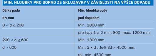 BEZ OZNAČENÍ TO NEJDENorma specifikuje technické požadavky pro každý typ skluzavky - průřez koryta, startovní a koncové úseky, tunely a kryté úseky, přístup na skluzavku a její dojezd, záchytné zařízení a zařízení pro bezpečný odchod uživatele. Důležitou veličinou pro bezpečný dojezd uživatele skluzavky je kromě délky dojezdu i hloubka dopadu.