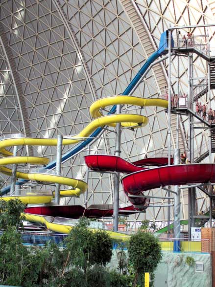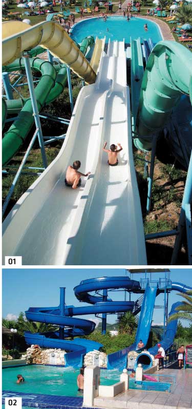 01, 02 > Aqualand v Corfu, který patří k největším v Evropě, nabízí zábavu pro všechny věkové kategorie. Návštěvníci si mohou vybírat z několika desítek skluzavek, samozřejmě i adrenalinových. Jedna z nich je vysoká 24 metrů.