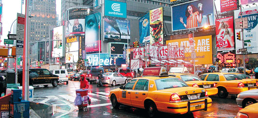 Žluté taxíky stojí v nekonečných zácpách a turisté tak mají možnost si dlouhé minuty prohlížet reklamní nosiče.