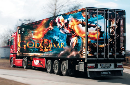 Herní série God of War, která je známá z PlayStation platforem, se dočkala svého prvního pokračování exkluzivně pro PlayStation 3. Na oslavu tohoto dobrodružství, které je finálním dílem celé série, přinesl PlayStation speciální akci -- kamion na téma God of War 3, kdy boční a zadní stěna kamionu vyvolává dojem 3D obrazu.