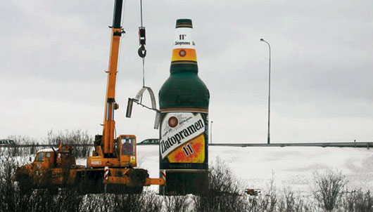 Na realizaci obří pivní lahve se podílela také firma Quo. Jedná se o součást komunikační kampaně nizozemské pivovarnické skupiny Heineken, která je lídrem v tomto mladém segmentu balení piva do 1,5 litrových maxilahví (tzv. trojpivo) na českém trhu a pod níž patří právě pivovar Zlatopramen z Ústí nad Labem-Krásného Března.