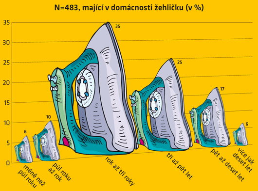 Žehličku najdeme v naprosté většině rodin, v rámci internetové populace ji pouze pět domácností ze sta nevlastní. Jsou to hlavně mladé rodiny a domácnosti tvořené muži. Nepořizují si ji hlavně proto, že buď nosí oblečení, které žehlit nepotřebuje, nebo oblečení žehlit nechtějí. I přes značné rozšíření je zde však velký potenciál, třetina oslovených o nákupu žehličky nyní uvažuje. V průměru využíváme žehličky staré tři až čtyři roky. Více než polovina z nich je dokonce mladší tří let, s rostoucím věkem respondenta ale roste stáří spotřebiče.