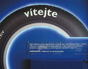 Pneu je doplněna motem servisů Euromaster. Motiv je vyroben výřezem do samolepicí fólie a je instalován na čirém plexiskle s distancemi.