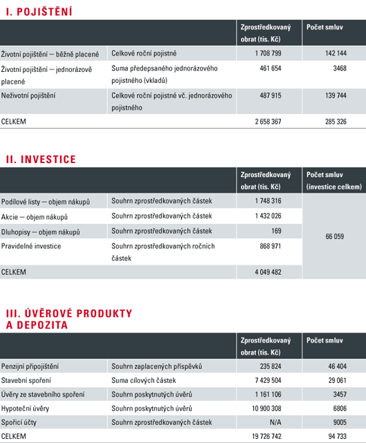 U investičních produktů sledují obě sdružení podrobnou strukturu peněžních toků, které umožňují identifikovat poměr jednotlivých nástrojů. Celkem byly v této oblasti zprostředkovány produkty za 4 049 482 tis. Kč na základě 66 059 smluv.
