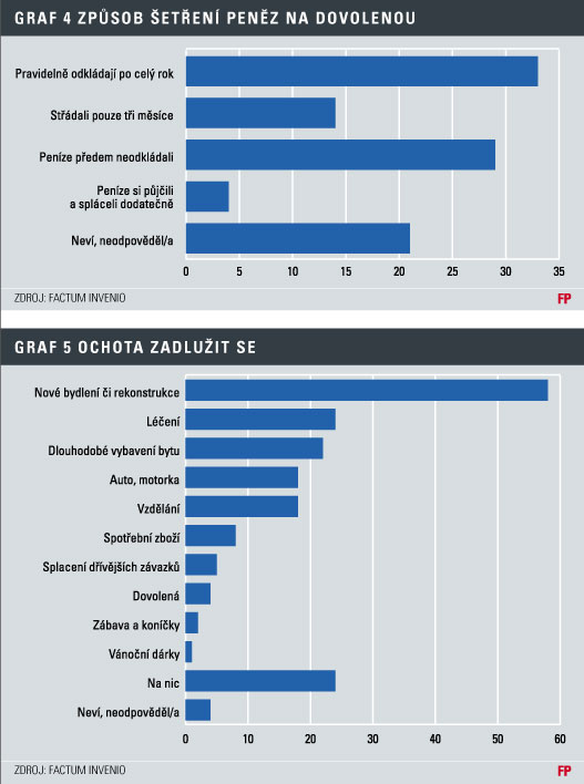 Na dovolenou si půjčila podle průzkumu jen malá část domácností - pouze 4 %. Pohříchu však v této skupině kralují právě rodiny s nižšími příjmy. Naopak třetina domácností na dovolenou odkládá peníze postupně po celý rok. Dalším 14 procentům stačí uskromnit se na tři měsíce, kdy potřebnou částku naspoří. Tři lidé z deseti plánovitě na dovolenou nešetří, ale plánují takovou rekreaci, na kterou prostě mají.
