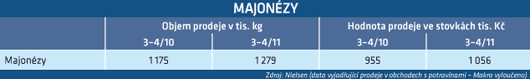 V období Velikonoc roste také prodej majonéz. Podle údajů agentury Nielsen za měsíce březen a duben 2011 oproti předchozímu roku v prodaném množství o 8,9 % a v hodnotě o 10,6 %. "Až 83 % objemových prodejů se během Velikonoc uskuteční přes kanál moderního trhu, kam spadají hypermarkety, supermarkety a diskonty. Tradiční trh meziročně v době Velikonoc ztrácí na své významnosti. Růst kategorie je nejvíce tažen supermarkety (včetně diskontů), jejichž objemové prodeje rostou o 11,3 % a hodnotové dokonce o 15,4 %. Díky tomuto růstu kanál supermarketů dosáhl téměř polovičního podílu vygenerovaného objemu v období Velikonoc," uvádí Jitka Hlušková Vojáčková, client executive společnosti Nielsen.