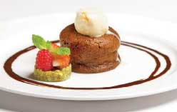 Dortík: Ve vodní lázni rozpustíme černou čokoládu, žloutky a máslo. Bílky vyšleháme do pevného sněhu a opatrně metlou vmícháme do vlažné směsi. Celé necháme asi 1 hodinu odpočinout v lednici. Těsto dále plníme do vymazaných formiček asi z jedné poloviny a pečeme v troubě při teplotě 180 °C asi 8 minut. Upečený dortík z formičky vyndáme, měl by být na prostředku jemně nedopečený, a podáváme se zmrzlinou a ořechovým pestem. Čokoládový dortík je jedním z klasických teplých dezertů, je vyroben z hořké čokolády s vyšším obsahem kakaa. Tento dezert velmi oceníte nejen v těchto chladných dnech, ale i jako vrchol slavnostní hostiny, chuť čokolády se snoubí s vanilkovou zmrzlinou doplněnou ořechovým pestem. K dezertu doporučuji dezertní víno s vyšší kyselinkou, například Chapoutier Banyuls.