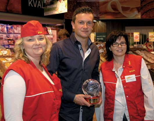 V typických "Billa" stejnokrojích (vlevo) Simona Breen, ředitelka marketingu, a Šárka Brennerová, personální ředitelka společnosti Billa. Uprostřed s cenou Petr Jiráček, vedoucí prodejny na Karlově náměstí v Praze.