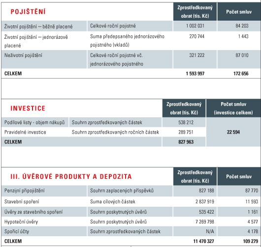 U investičních produktů sledují obě sdružení podrobnou strukturu peněžních toků, které umožňují identifikovat poměr jednotlivých nástrojů. Celkem byly v této oblasti zprostředkovány produkty za 827 963 tis. Kč na základě 22 594 smluv.