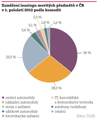 Automobily jsou podle údajů České leasingové a finanční asociace (ČLFA) suverénně nejčastější komoditou, kterou si tuzemští zákazníci pořizují prostřednictvím leasingových nebo úvěrových produktů. Členské společnosti ČLFA v 1. pololetí letošního roku financovaly silniční dopravní prostředky 26 miliardami korun. To představuje 44 % celkové částky, kterou členské firmy ČLFA uvolnily na veškeré své obchody. Z toho 16,5 miliardy korun bylo určeno na pořízení automobilů, což odpovídá 40 % všech nových osobních vozů prvně registrovaných v České republice v prvních šesti měsících letošního roku.