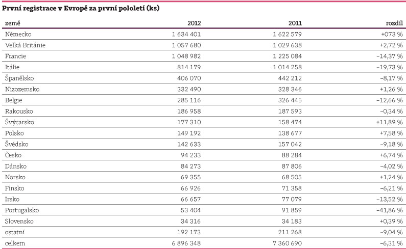 První pololetí na českém trhu motorových vozidel ozdobil nečekaný (zejména ve srovnání s ostatní Evropou) vzestup počtu nově registrovaných osobních automobilů, když v ostatních kategoriích pokračoval trend sestupný a souzněl s obdobným negativním vývojem ve velké většině zemí starého kontinentu.