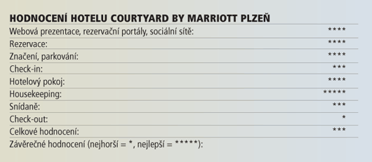 Hotel Courtyard by Marriott Plzeň lze najít na většině významnějších rezervačních portálů. Recenze uživatelů nejsou vždy zcela jednoznačné, nicméně výtky se povětšinou týkají předem známých věcí, typickým příkladem je chybějící wellness nebo zpoplatněné internetové připojení na pokojích. Test cenové parity mezi rezervačním systémem řetězce Marriott a jednotlivými portály proběhl poněkud chaoticky. Základní ceně dvoulůžkového pokoje na noc rezervovaného přes "domovský" rezervační systém Marriott se přiblížila pouze Expedia.com. Všichni ostatní byli dražší o 10-20 % (Booking.com, Hotel.de, Hotels.com atd....).