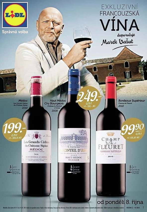Nečekaným marketingově-komunikačním směrem se vydal Lidl. Diskontní řetězec začal lákal na kvalitní francouzská vína. Nabídka francouzských vín je součástí konceptu tematických týdnů, v tomto případě se jí však dostává nadstandardní podpory. Před mohutným mediálním atakem na podporu čtyř desítek vín (POS, inzerce, vklady, PR, TV a rozhlasová reklama) nebylo úniku. Je to také poprvé, co si Lidl u nás zvolil tvář kampaně. Tou se stal Marek Vašut, který kromě nedávné reklamy na lék Prostenal dělal v 90. letech těžkou hlavu výrobci kávy Douwe Egbert, jíž lidé díky reklamě s ním začali přezdívat Vašutka.
