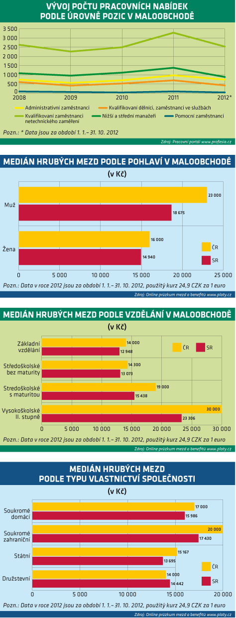 Zaměstnanci v maloobchodě vydělávají v České republice více než na Slovensku, rozdíl se však postupně zmenšuje, od 15 % v roce 2008 po současných 10 % ve prospěch českých pracujících. Vliv na zmenšení rozdílu měl každoroční nárůst mezd na Slovensku (za celé sledované období mluvíme o 8 %). V České republice mzdy nejdříve stagnovaly (2009), následně klesly o 2 % (2010), v roce 2011 se dostaly zpátky na úroveň z roku 2008, a letos pozorujeme mírné navýšení.