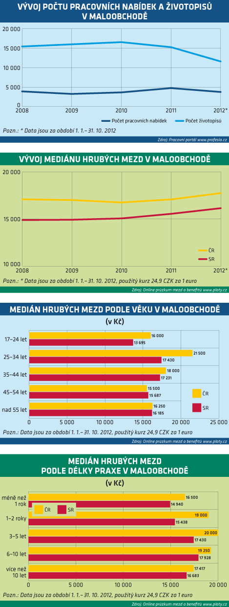 Všechny mzdové údaje uvedené v tomto článku pochází z on-line průzkumu mezd a benefitů Platy.cz. Data představují medián celkových hrubých mezd, do kterých jsou započítány odměny a provize. Medián je střední hodnota, tzn. že 50 % lidí vydělává více, než je uvedená hodnota a 50 % zase méně. Zatímco průměr je součet mezd, který je vydělený počtem lidí v průzkumu. V maloobchodě je medián nižší hodnota než průměr, protože je velké množství lidí s nízkou mzdou.