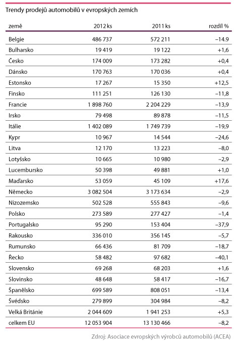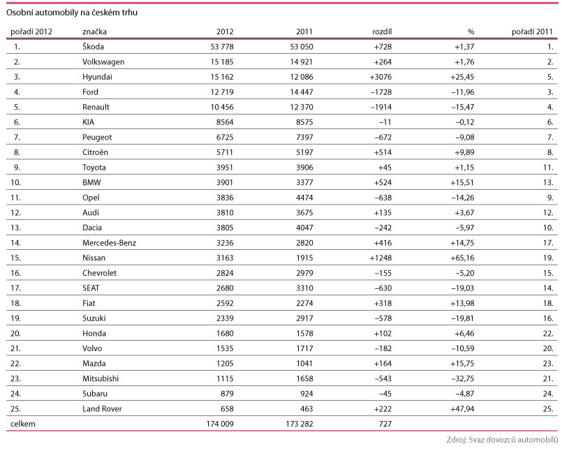 V roce 2012 bylo v Česku (přes nefunkčnost registru) zaznamenáno 174 009 nových registrací osobních vozidel, což však znamená jev v evropském měřítku téměř unikátní. Nikoli pokles, ale růst! Byť zanedbatelný, protože činí pouhých 727 kusů, tedy +0,42 %. Takže se vlastně jedná spíše o stagnaci. Co by však za to dala například taková automobilová velmoc, jakou nesporně je Itálie, jejíž trh za rok zhubl o 20 %! Český automobilový byznys tedy (zatím) nekolabuje, ale jen obtížněji dýchá.