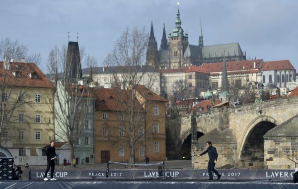 Den Rogera F. v Praze: Tenis na Vltavě, bratření s Berdychem i líbání Krnáčové. Podívejte se na fotogalerii z návštěvy Rogera Federera, který do Prahy přijel propagovat Laver Cup.